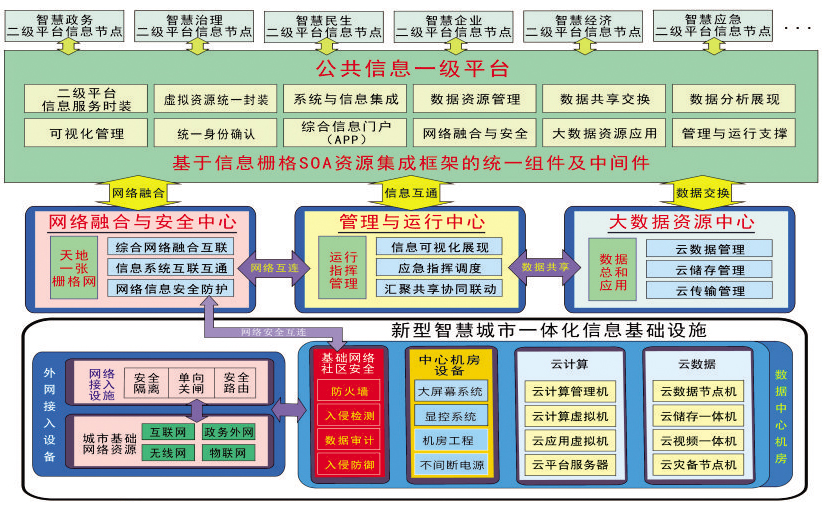 “三中心一平臺(tái)”遵循新型智慧城市建設(shè)六大核心要素。通過(guò)天地一張柵格網(wǎng)構(gòu)成一個(gè)“虛擬化的復(fù)雜巨系統(tǒng)”。實(shí)現(xiàn)網(wǎng)絡(luò)資源、計(jì)算資源、存儲(chǔ)資源、數(shù)據(jù)資源、信息資源、平臺(tái)資源、軟件資源、知識(shí)資源、專(zhuān)家資源等的全面共享共用。將“信息柵格”技術(shù)應(yīng)用于智慧城市的“三中心一平臺(tái)”是信息與系統(tǒng)集成基礎(chǔ)設(shè)施的應(yīng)用創(chuàng)新。